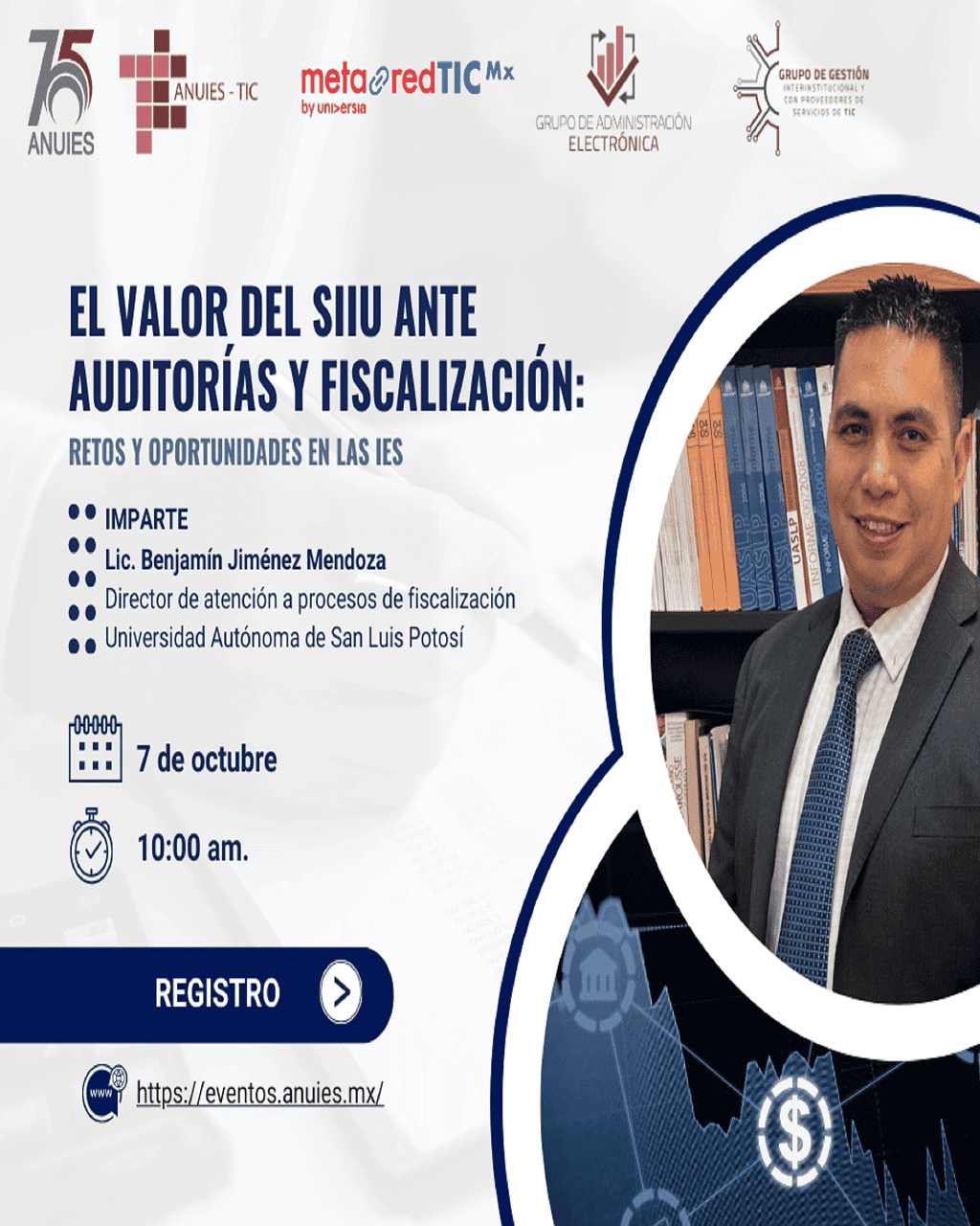 La Asociación Nacional de Universidades e Instituciones de Educación Superior (ANUIES), a través de su Comité ANUIES-TIC y el Grupo de Administración Electrónica, tiene el honor de invitarle al webinar: "El valor del SIIU ante Auditorías y Fiscalización: Retos y Oportunidades en las IES"